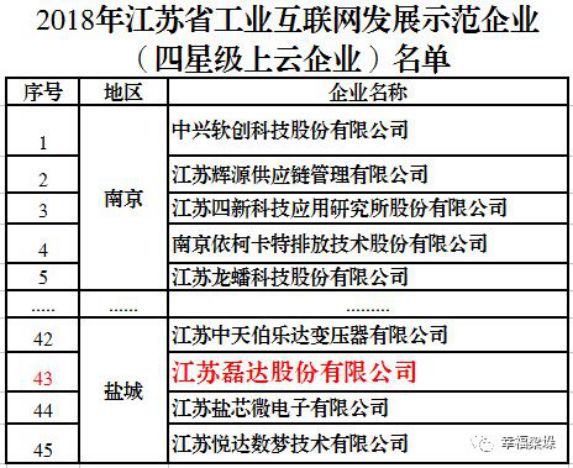 近日,省经信委通过企业申报、各地审核推荐、专家评审等环节,最终认定25家企业为2018年江苏省工业互联网发展示范企业(五星级上云企业)、62家企业为江苏省工业互联网发展示范企业(四星级上云企业)。其中(磊达集团)江苏磊达股份有限公司被认定为四星级上云企业,这标志着磊达集团在运用工业互联网发展现代企业过程中又一次处于示范行列。