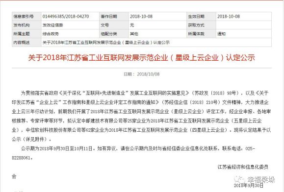 2017年12月,江苏省正式印发《加快推进企业上云三年行动计划的通知》,围绕工业云平台、星级“上云”企业、云服务体系、工业互联网标杆工厂、“互联网+先进制造”特色基地建设等五个方面,全面推进“企业上云”。